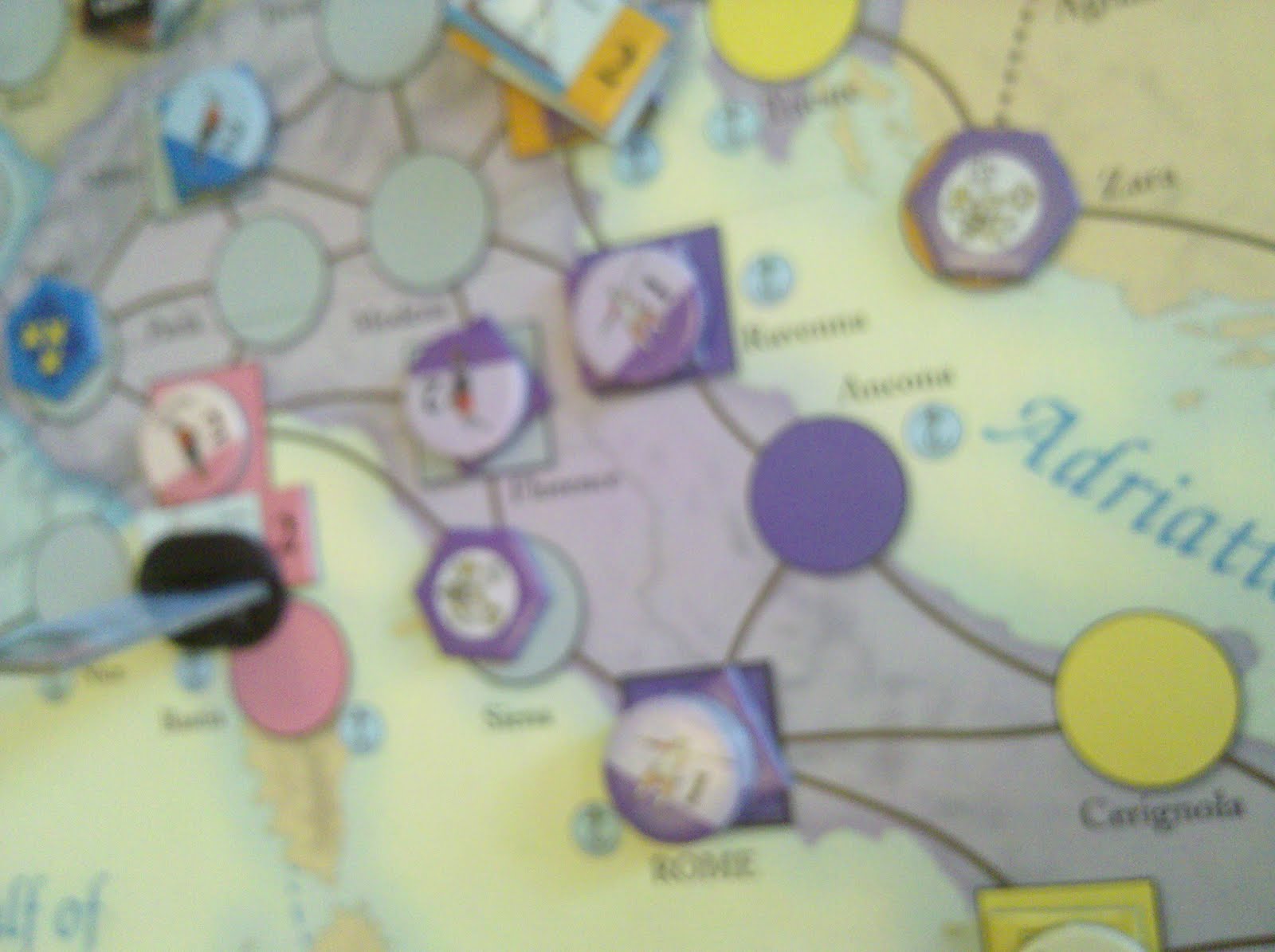 With 23 VP's, i know i have a big target on me. The question is, who is going to come after me? My biggest concern is Tim, as Charles coming up from Naples with a large Haps army could be bad. Tim also has a bunch of cards so he could take Florence and Vencice from me. The Otts are also a concern but i am better prepared to deal with them as i have a good sized fleet in the Adriatic.